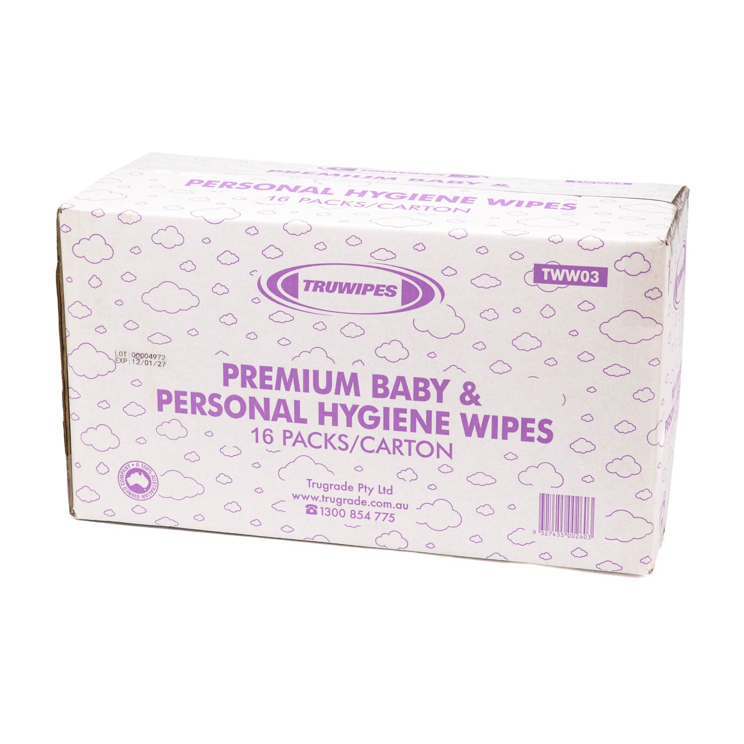 Truwipes Premium Baby & Personal Hygiene Wipes are ultra-soft, thick, and pH-balanced for gentle everyday care. Designed for sensitive skin, each 80-pack contains wipes that are alcohol-free, paraben-free, hypoallergenic, and fragrance-free—making them ideal for babies, aged care, beauty services, and personal hygiene use. Infused with aloe vera and crafted from a strong polyester/viscose blend, these wipes offer both comfort and durability. Packaged in a resealable dispenser bag for convenient, hygienic dispensing. Also available in bulk cartons containing 16 packs (1,280 wipes).