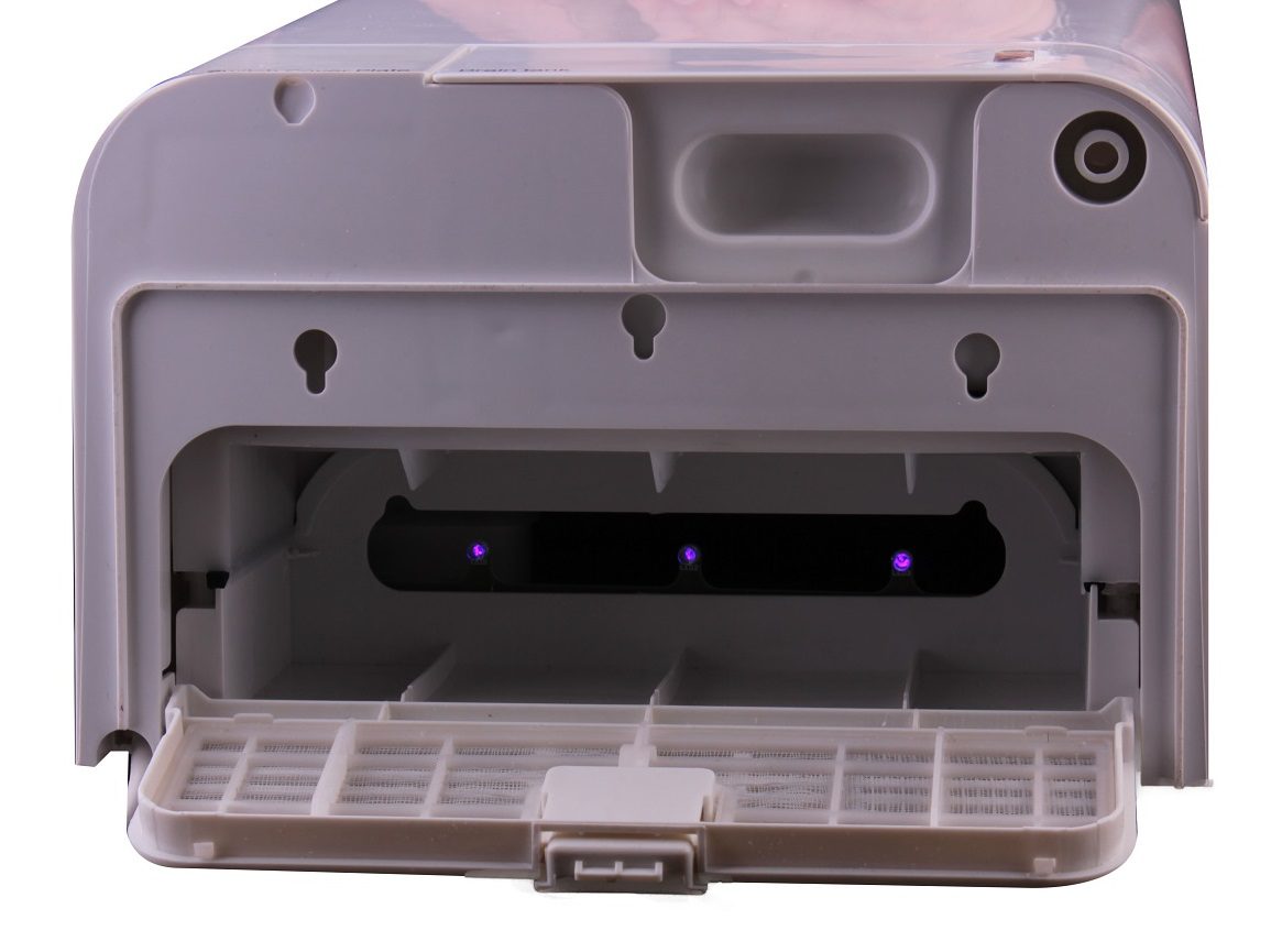 Triple filtration system, external and internal HEPA filter with an extra internal UV sterilization system. The automatic UV sterilization automatically sterilizes the internal HEPA filter which then purifies the air used to dry the hands.